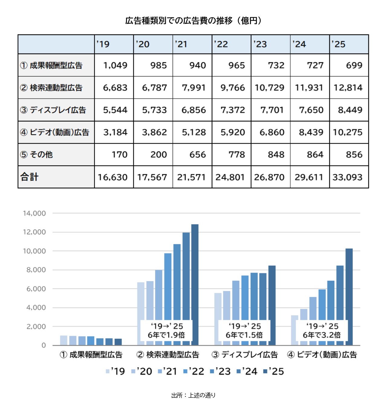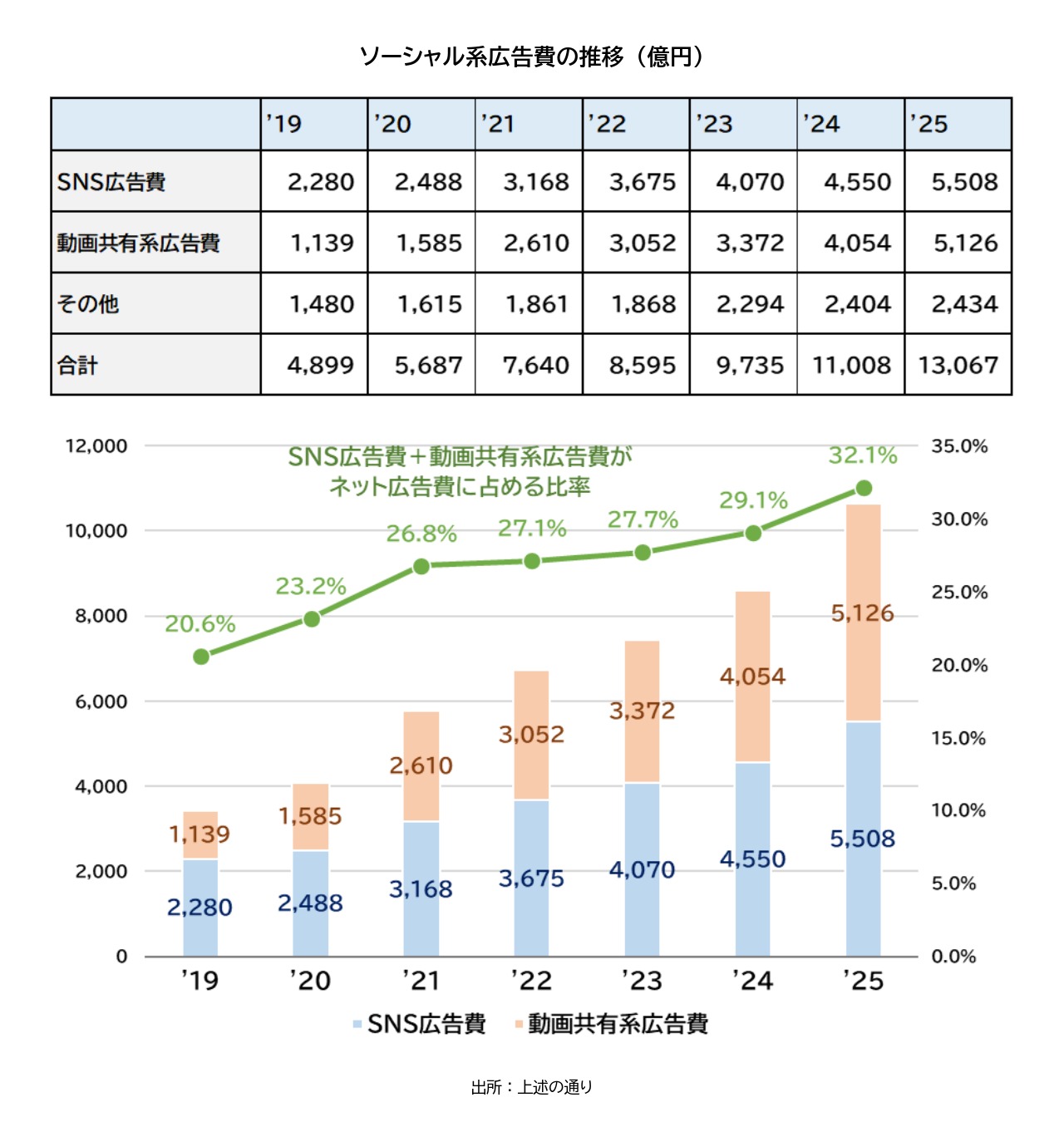 ここで、このふたつを合わせた広告費がネット広告費に占める比率を計算してみました。2019年はわずか20.6%に過ぎませんでしたが、2025年委は32.1%にまで至っています。単純計算でネット広告費の3分の1が「SNS広告費+動画共有系広告費」ということです。広告主がSNSやYouTube等への広告に年々重心を移し始めている表れと言ってもよいでしょう。