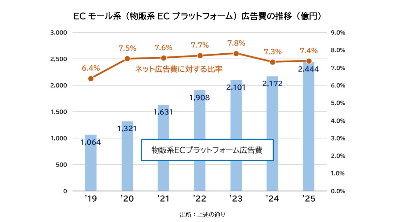 2025年のECモール系広告費は2,444億円となりました。2019年が1,064億円ですので、6年で2.3倍の伸びです。ECモールでの販売を重視している事業者にとって、ECモールの広告は重要な手段であることは間違いありません。実際6年で2.3倍に拡大していますので、間違いなく成長している分野です。