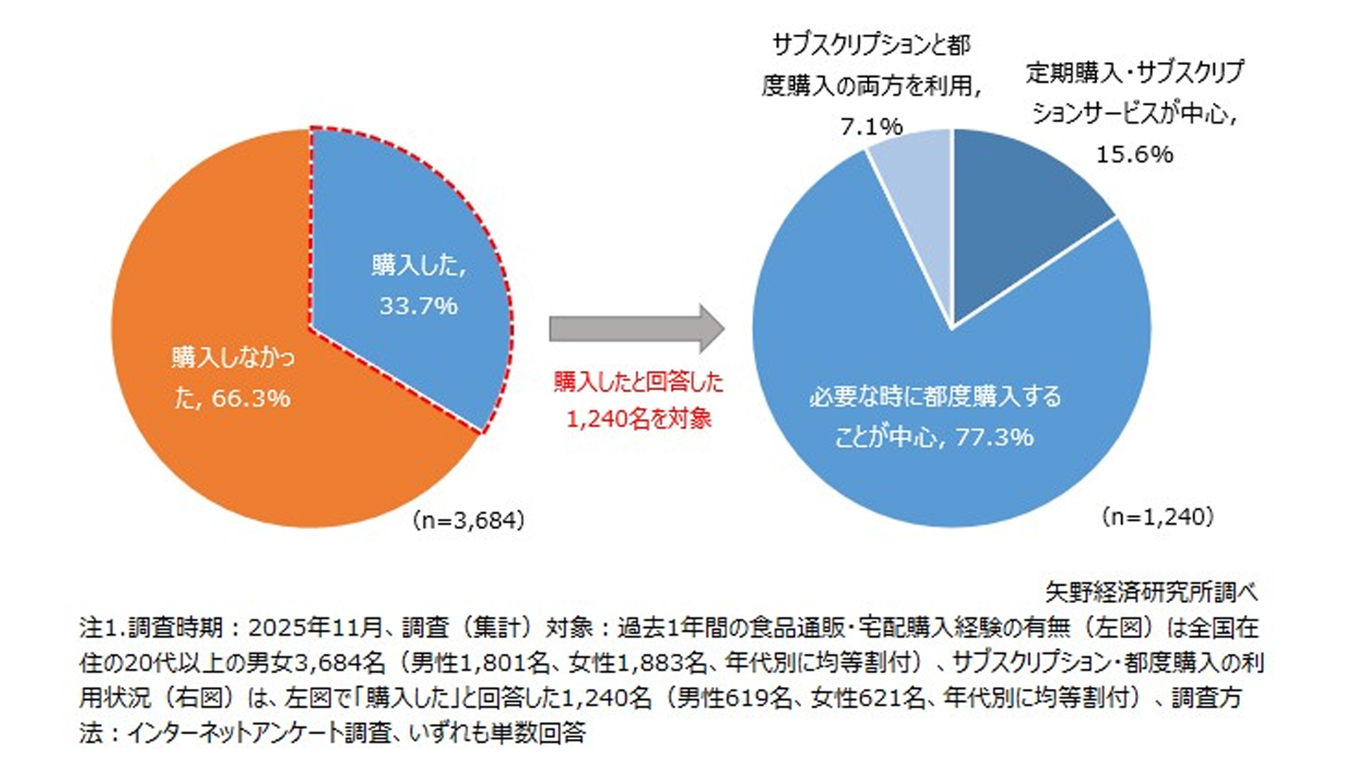 調査は昨年11月、全国の20代以上の男女3684人を対象に実施した。過去1年間にインターネット通販や宅配サービスを利用して、食品を購入したことがあるかどうかを聞いたところ、「購入した」が33.7%、「購入しなかった」が66.3%を占めた。