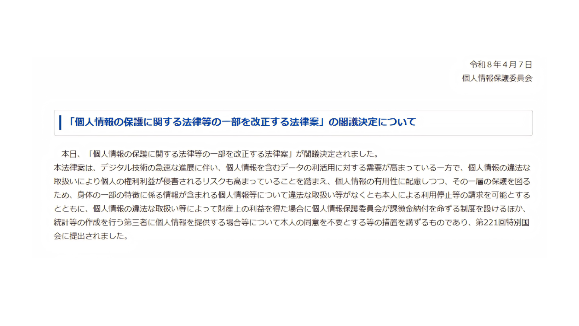 2026年4月7日、政府は個人情報保護法の改正案を閣議決定しました。この改正の目玉が「課徴金制度」の新設です。従来は行政命令と刑事罰しか手段がなく、違反行為で得た経済的利益は事業者の手元に残る構造でした。改正後はこの構造が根本から変わります。EC事業者が直面するリスクを4つの軸で整理します。