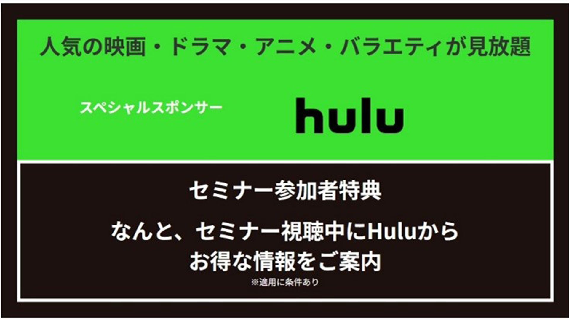 スペシャルスポンサーとして動画配信大手のHuluが、イベントを2日間にわたってサポートする。