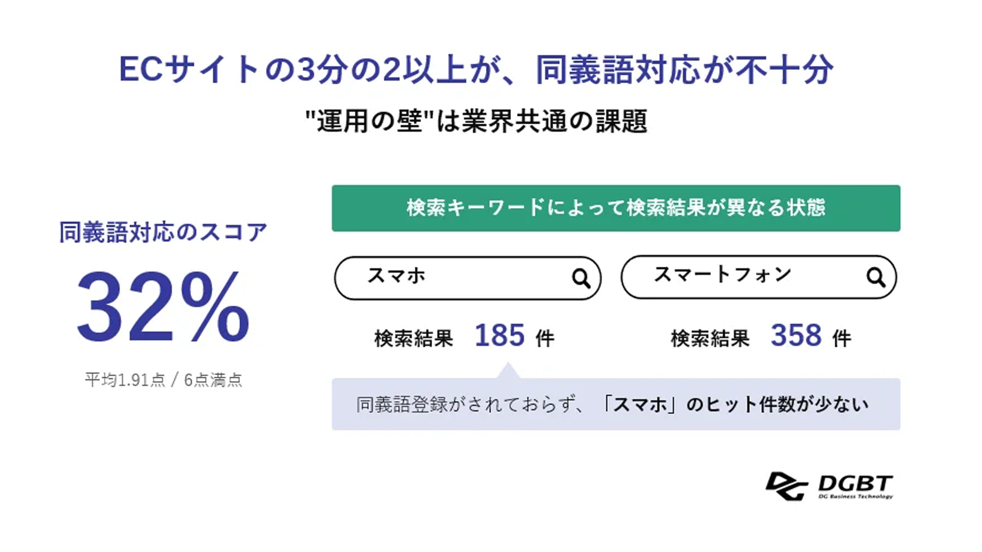 多くのECサイトで「同義語」「検索結果0件」への対応に遅れ…DGビジネステクノロジーの調査