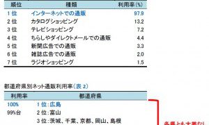 ...「ちらしやダイレクトメール」(4.4%)、5位が「新聞広告」(3.3%)、6位が「雑誌広告」(2%)、7位が「ラジオショッピング」(1.5%)となった。都道府県別では、広島がネット通販利用率100%...