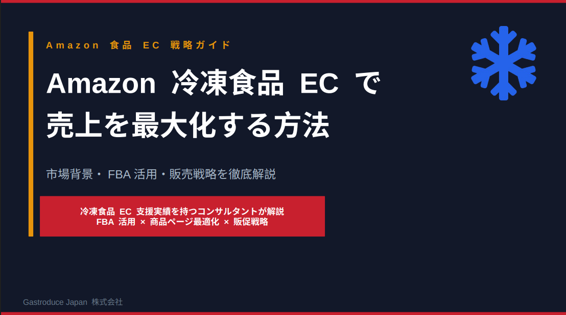 本資料は、冷凍食品EC支援実績を持つGastroduce Japan株式会社が提供する、Amazon冷凍食品EC向けの実践的な戦略ノウハウ集です。 冷凍食品EC市場は、オンライン購買の一般化を背景に急成長しています。時短・...