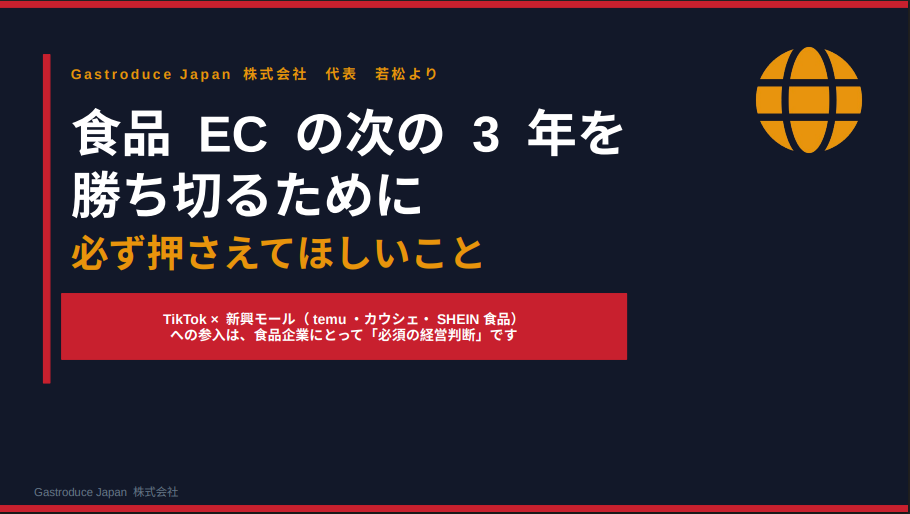 本資料は、Gastroduce Japan株式会社代表・若松氏が提供する、食品EC事業者向けの中期戦略提言です。TikTok×新興モール(temu・カウシェ・SHEIN食品)への参入を「必須の経営判断」と位置づけ、今後3年間...
