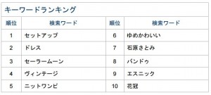 ...リル(FRIL)」内で、ユーザーが検索したワードとアンケートによるもの。 キーワード部門は、1位「セットアップ」、2位「ドレス」、3位「セーラームーン」、4位「ヴィンテージ」、5位「ニットワンピ」、...