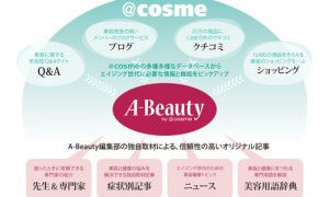 ...のエイジングコスメのお試しレポートなどを掲載する。その他、「美容用語辞典」「ブログ」「クチコミランキング」「先生&専門家」などのコンテンツがある。 ■「A-Beauty」