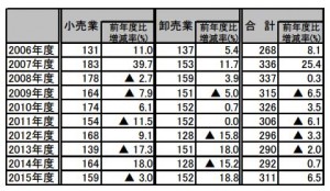 (株)帝国データバンクが8日発表した「アパレル関連業者の倒産動向調査」によると、2015年度のアパレル関連業者の倒産件数は、前年度比6.5%増の311件となり、4年ぶりに300件を上回った。また、アパレル...