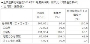 日本生協連が22日発表した「全国66主要地域生協の2014年11月度の供給状況(速報値)」によると、11月度の生協の供給実績は前年同月比99.6%の2090億2100万円となった。 店舗は...