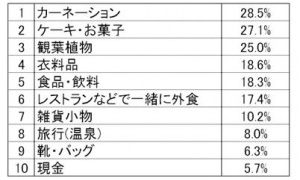 母の日に贈りたいもの、28%「カーネーション」・27%「菓子」