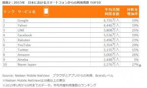 ニールセン(株)が15日発表したPCとスマートフォンの「2015 インターネットサービス利用者数ランキング」によると、2015年のインターネットサービス利用者は、PCからの1位が「Yahoo」で3892万...