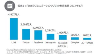 ニールセン(株)が7日発表した2017年1月「『SNSやコミュニケーションアプリ』利用状況」によると、「LINE」はスマートフォン利用者の約8割にあたる4807万人が利用していることがわかった。&nbs...