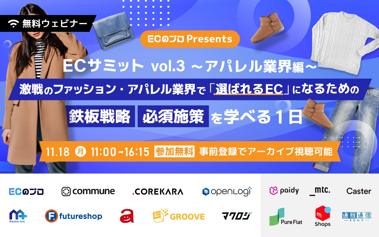 【11/18_WEB】ECサミットvol.3〜アパレル業界編〜 激戦のファッション・アパレル業界で 「選ばれるEC」になるための鉄板戦略・必須施策を学べる1日