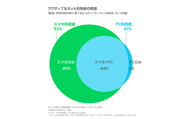 ネット利用者の93%が「スマホで」、PCのみ利用は2% -