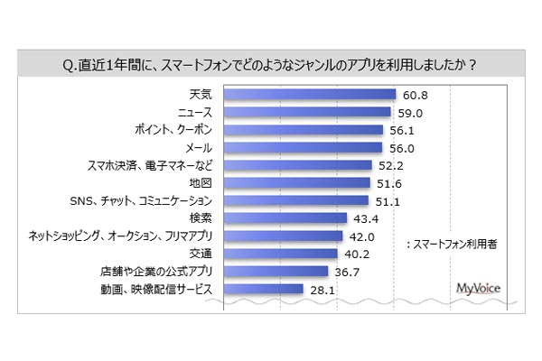 スマホアプリの利用率、1位は68%で「天気」・「EC」... -