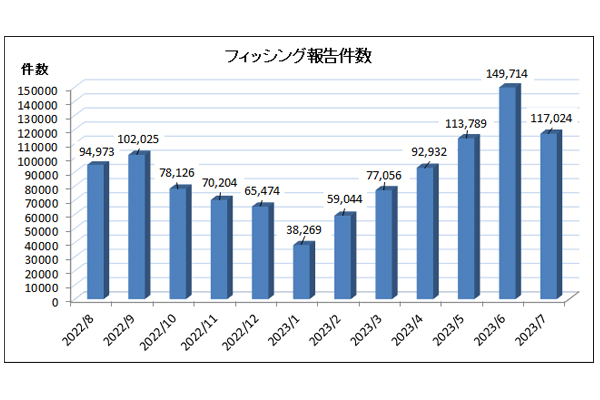 フィッシング報告件数、7月は22%減の11万7024件... -