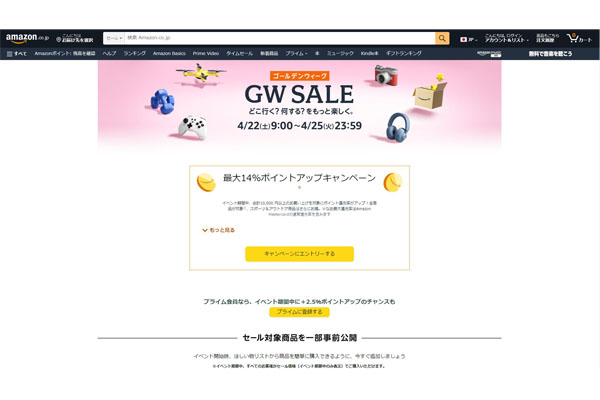 最大14%ポイント還元も、Amazonが「GWセール」開催 -