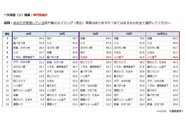 エイジングの実感、若年層は「毛穴」・中高年は「白髪」「シミ」 -