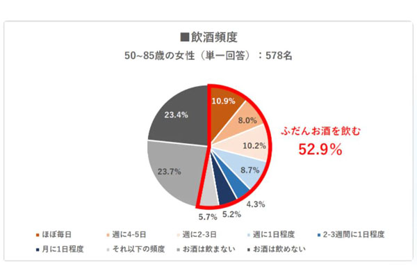 お酒を飲むシニア女性は52%、「ほぼ毎日飲む」が10%に -