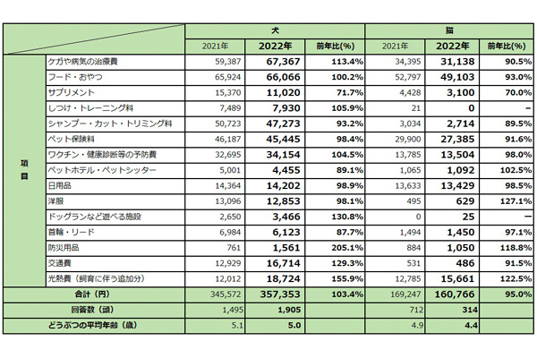 ペットにかける年間支出、22年は外出に伴う費用・光熱費が増加 -