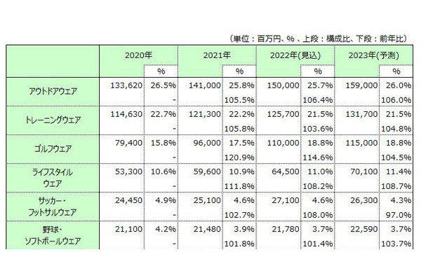 国内スポーツアパレル市場、22年は6.7%増の5841... -