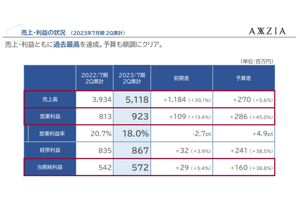 アクシージア2Qは増収増益、売上・利益ともに過去最高 -