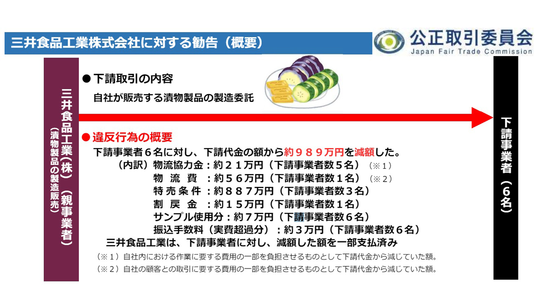 漬物製品の下請代金989万円を不当に減額…公取、三井食... -