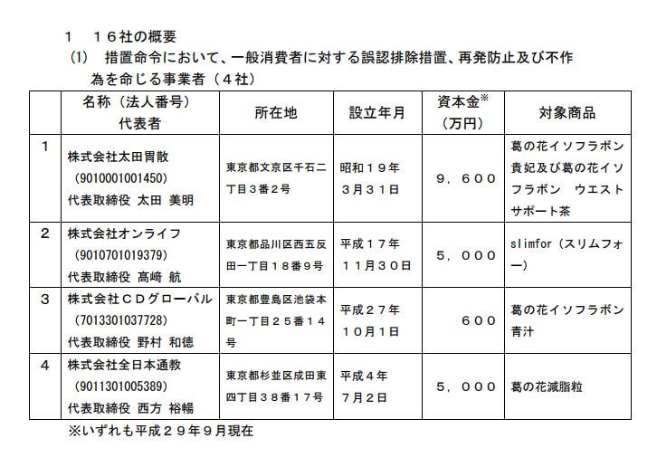 措置命令を受けた16社(19製品)は、(株)太田胃散(『葛の花イソフラボン貴妃』『葛の花イソフラボン ウエストサポート茶』)、(株)オンライフ(『slimfor(スリムフォー)』)、(株)CDグローバル(『葛の花イソフラボン 青汁』)、(株)全日本通教(『葛の花減脂粒』)、 ありがとう通販(株)(『青汁ダイエットン』)、(株)ECスタジオ(『イージースムージーグリーン』)、(株)協和(『ウエストシェイプ』)、(株)スギ薬局(『葛の花ウエストケアタブレット』『葛の花ウエストケアスムージー』『葛の花プレミアム青汁』)、(株)ステップワールド(『ヘラスリム』)、(株)テレビショッピング研究所(『葛の花サプリメント』)、(株)Nalelu(『葛の花ヘルスリム27』)、(株)ニッセン(『メディスリム(12粒)』)、日本第一製薬(株)(『お腹の脂肪に葛の花イソフラボンスリム』)、(株)ハーブ健康本舗(『シボヘール』)、ピルボックスジャパン(株)(『onaka(おなか)』)、(株)やまちや(『葛の花由来イソフラボン入り きょうの青汁』)。
