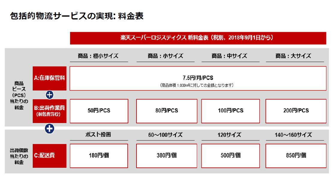 楽天では全店舗の商品を「楽天スーパーロジスティクス」で保管することを目指す。18年に千葉県流山市に、19年には大阪府枚方市に、新たな大規模物流センターを稼働させる。楽天コマースカンパニー マーケットプレイス事業 市場企画部の海老名雅貴氏は「全店舗の全商品を保管するには、どれだけのスペースが必要なのかという試算はできている。目標は全店舗の商品を受託すること。その上で、エリアでの需要予測によって荷物を最適に配置する」と話し、全店舗が「楽天スーパーロジスティクス」を利用できる体制を整えているとした。9月1日から同サービスの料金体系は新たなものとなり、店舗側にも価格メリットを提供する。