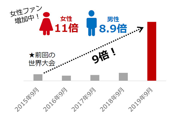 ヤフー(株)が運営するYahoo!ショッピングで、ラグビーグッズの売上が急増している。日本初開催の「ラグビーワールドカップ(W杯)2019日本大会」の熱気がそのまま反映した様相で、前回大会(2015年・英イングランド)の9倍に及んでいるという。