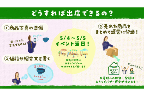 参加手数料は無料。販売するWEBページの作成は運営側が行い、決済までを「おうちでバザー」WEBサイト上で行う。お店や商品のPRも兼ねて、お店のWEBサイトやInstagramなどのSNSアカウントのURLを、「おうちでバザー」のページに記載することも可能。いままで通信販売を行なったことがない人や、ECサイトを持たない人でも出品できる。なお、『おうちでバザー』のWEBサイト公開は4月下旬となる。