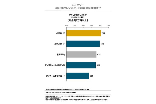 同時に公表された「J.D.パワー 2020年クレジットカード顧客満足度No.1」の各部門の総合満足度ランキングは次の通り。総合的な顧客満足度に影響を与えるファクターを年会費ごとに設定し、ユーザーの評価を基に1000ポイント満点で総合満足度スコアを算出した。