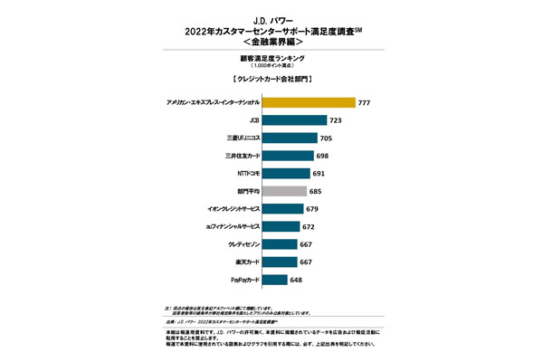 総合満足度ランキングでは、「クレジットカード会社部門」(対象10ブランド)の1位は『アメリカン・エキスプレス・インターナショナル』(777pt)で、2年連続。「利用のしやすさ」「用件に対し提供された情報や回答内容の適切さ」「説明の丁寧さ/応対の丁寧さ」問題の解決や対応に要した時間」の全4ファクターで最高評価を獲得した。2位は『JCB』(723pt)、3位は『三菱UFJニコス(705pt)となった。