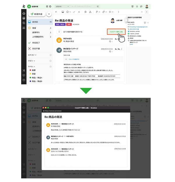 さらに2023年3月には、ChatGPTを活用した新サービスの第一弾として「要約機能」をリリースしました。時に1件の問い合わせでも10回以上やり取りが続くことがあり、全てを把握するには時間を要してしまいます。そんな時は「要約」ボタンを押すだけで過去のやり取りを要約して表示します。