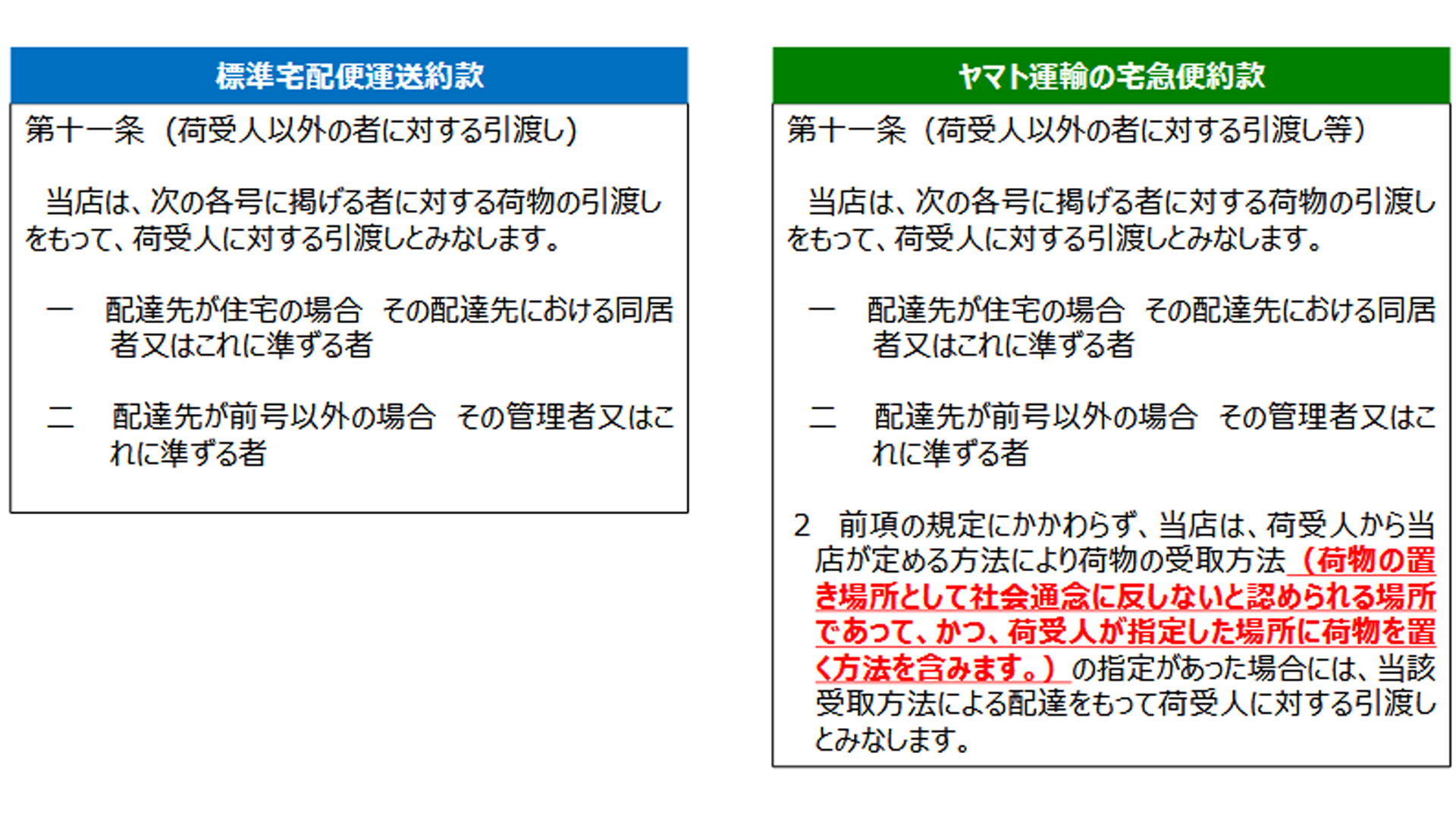 ただヤマト運輸だけは、「置き配」について記載。「荷受人が指定した『荷物の置き場所として社会通念に反しないと認められる場所』に置く方法を引き渡しとみなす」と明記している。