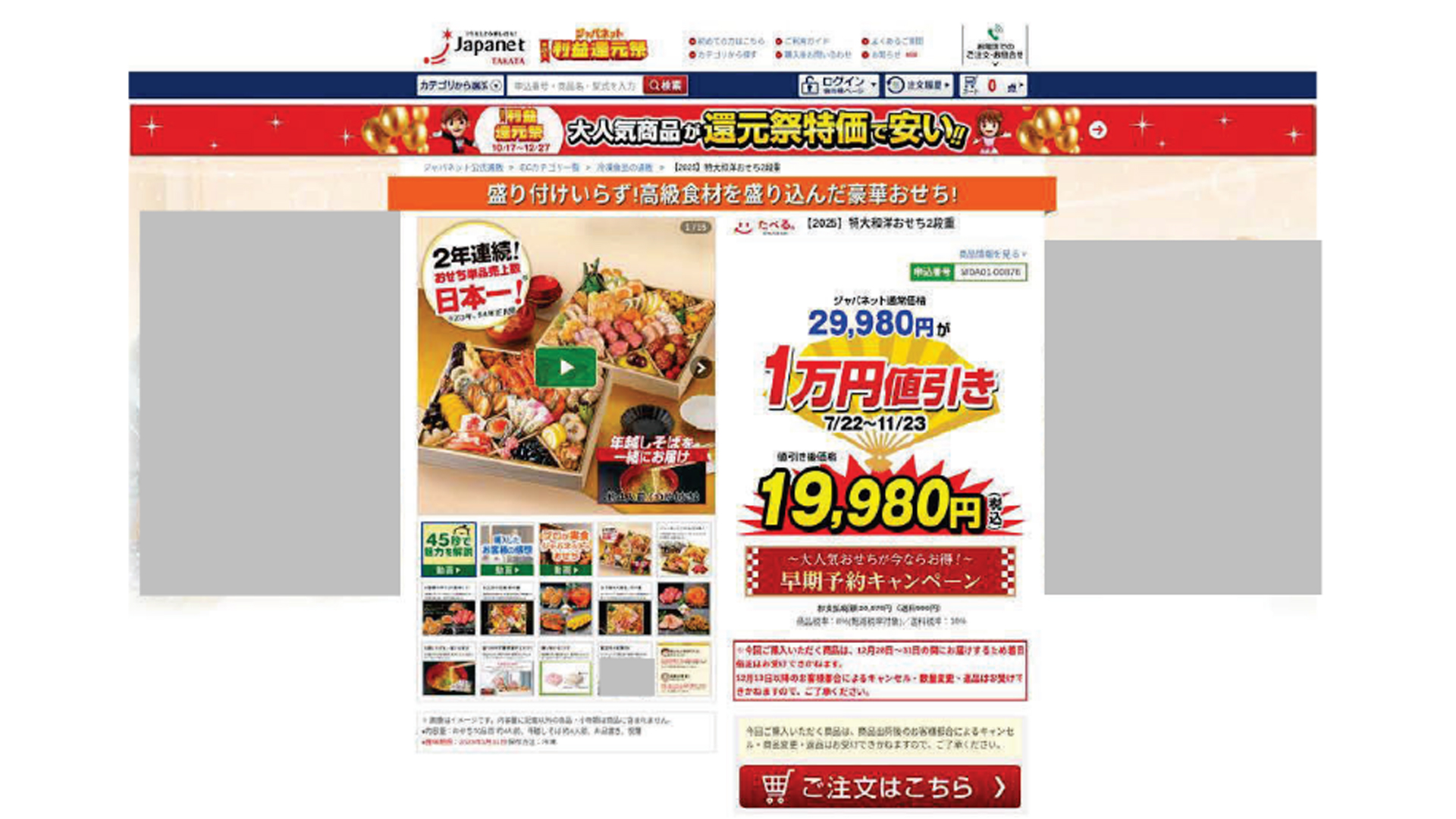 消費者庁は2025年9月、ジャパネットたかた(以下ジャパネット)が24年に公式サイトで展開したおせちの早期予約キャンペーン広告が、景品表示法の「有利誤認」にあたるとして措置命令を出した。24年7月から11月までの期間限定で、通常価格である2万9,980円の1万円引きとなる1万9,980円で販売。しかし、割引期間終了後には販売しなかったため、もともと通常価格での販売計画はなかったと判断した。2万9,980円という通常の将来価格と比較した消費者に誤認を与える不当な二重価格表示として、有利誤認に該当するとしている。