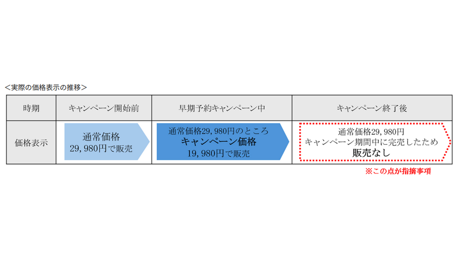 これに対しジャパネットは、表示が有利誤認には該当しないと反発し、経緯と自社の見解を発表。まずは消費者庁のガイドラインに沿って「過去の販売価格」を比較対照に用い、キャンペーン直前まで「通常価格29,980円」で販売しており、表示には適切な根拠があったと説明した。