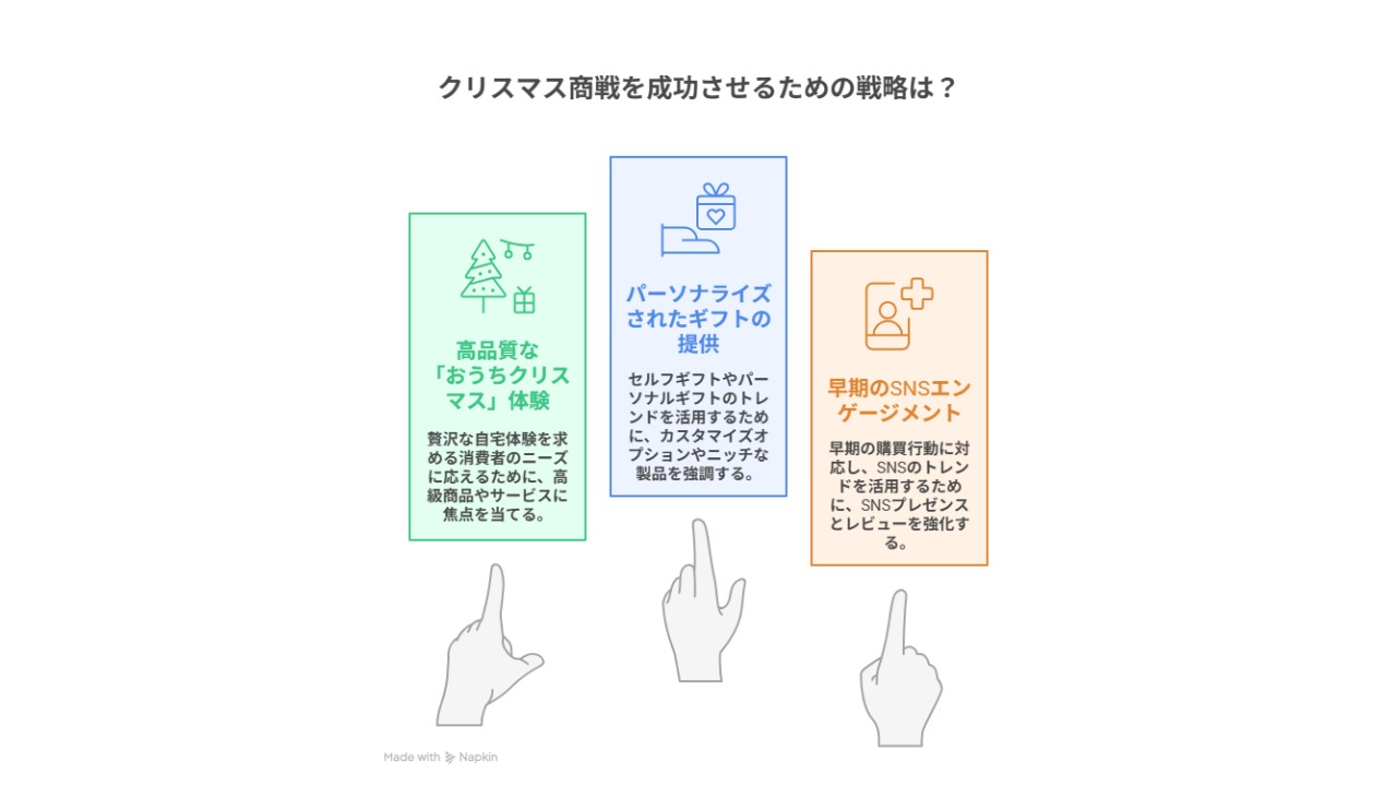 先の市場トレンドを踏まえ、クリスマス商戦で成果を上げるには楽天市場の特性を活かした戦略が不可欠です。多様化する顧客ニーズを捉え、特別な購買体験を提供するための5つの重要施策を解説します。