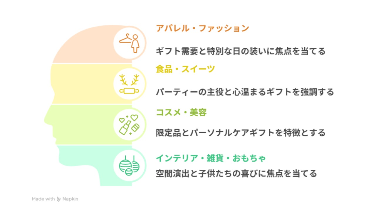 クリスマス商戦は専門店だけのものではありません。多様化するニーズを捉えれば、あらゆるカテゴリの店舗に商機があります。ここでは特に親和性の高い主要カテゴリを取り上げ、具体的な施策と訴求ポイントを解説します。