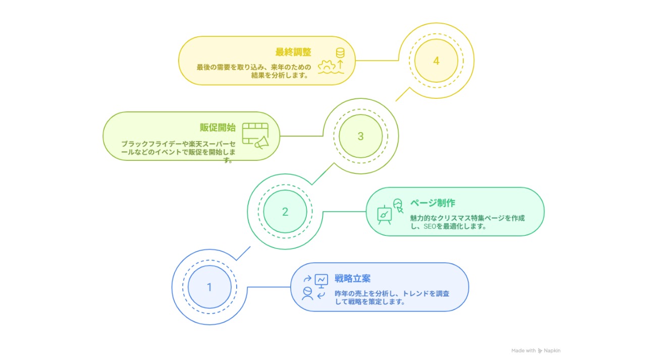 クリスマス特集ページを作成して回遊性を高めます。各商品ページにはギフトラッピングの詳細やお届け日を明記し、購入前の不安を払拭。SEO対策として計画したキーワードを商品名やキャッチコピーに盛り込みます。