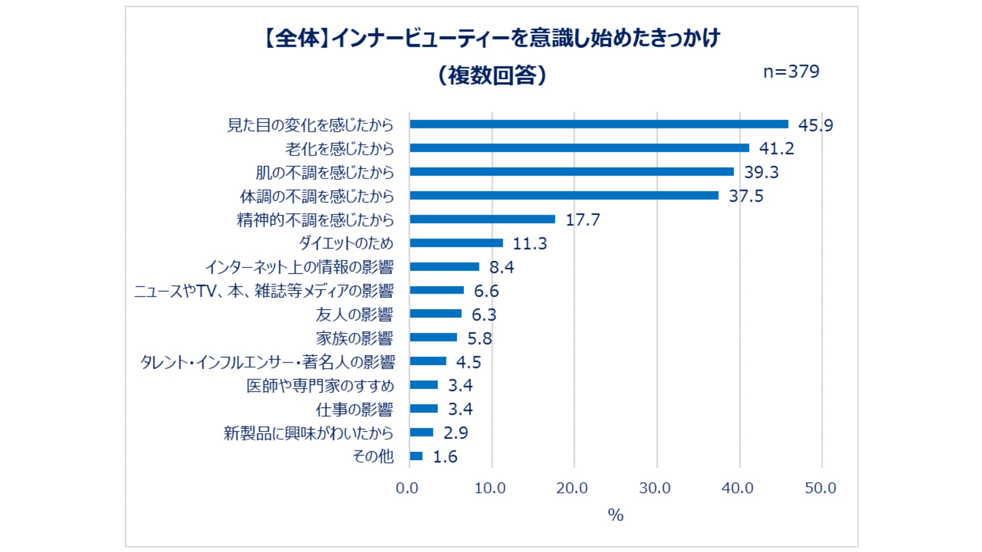 インナービューティーを意識している人に、そのきっかけを聞いた(複数回答)ところ、「見た目の変化を感じたから」(45.9%)、「老化を感じたから」(41.2%)、「肌の不調を感じたから」(39.3%)が上位に並んだ。
