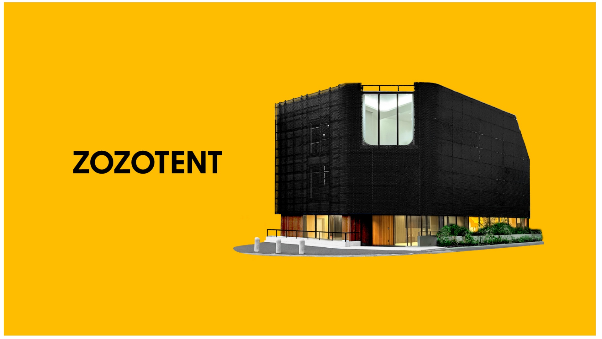 「ZOZOTENT」は地上3階、建物全体をテントで包み込んだようなデザインを施した。創業期の「ZOZOTOWN」でショップのオープン時に使用していたビジュアル「COMING SOON TENT」からインスピレーションを得て、未来への挑戦や出会いを象徴するモチーフとして表現した。