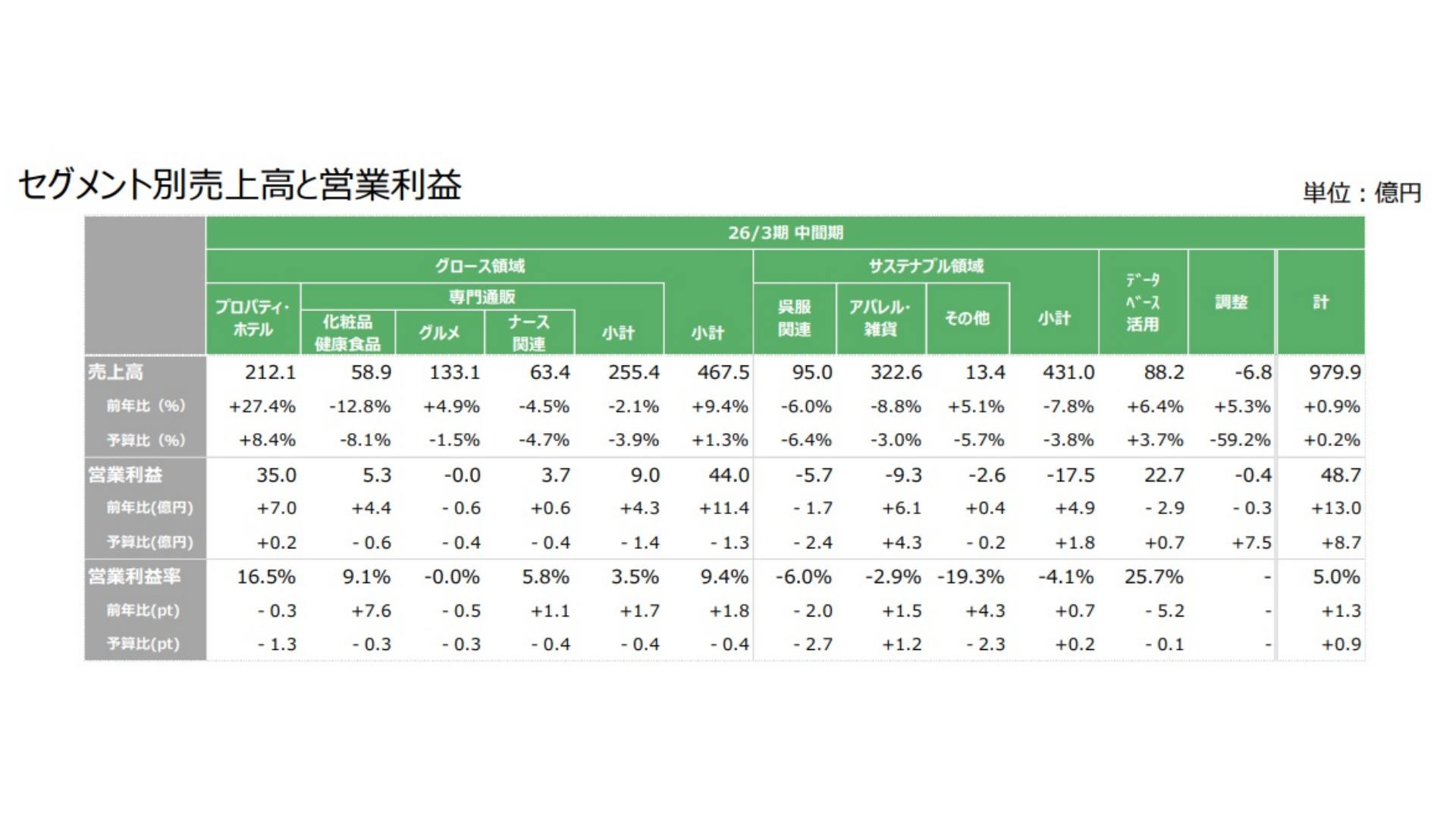ベルーナが10月31日発表した2026年3月期第2四半期(4月~9月)の連結決算は増収増益となり、売上高が同0.9%増の979億9200万円、営業利益が同36.5%増の48億7400万円、純利益が同29.7%増の33億2600万円だった。