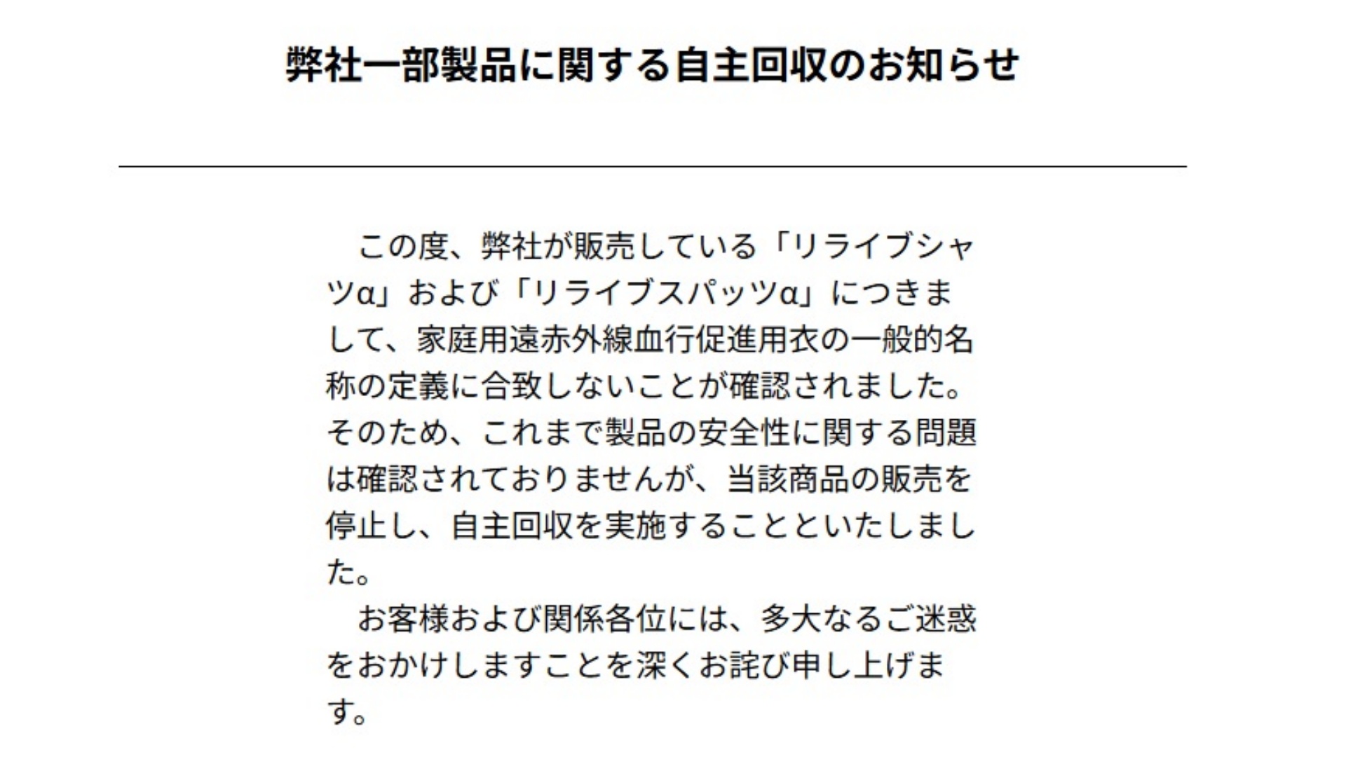 りらいぶ、血行促進のシャツなど約48万着を自主回収…厚労省の定義に合致せず