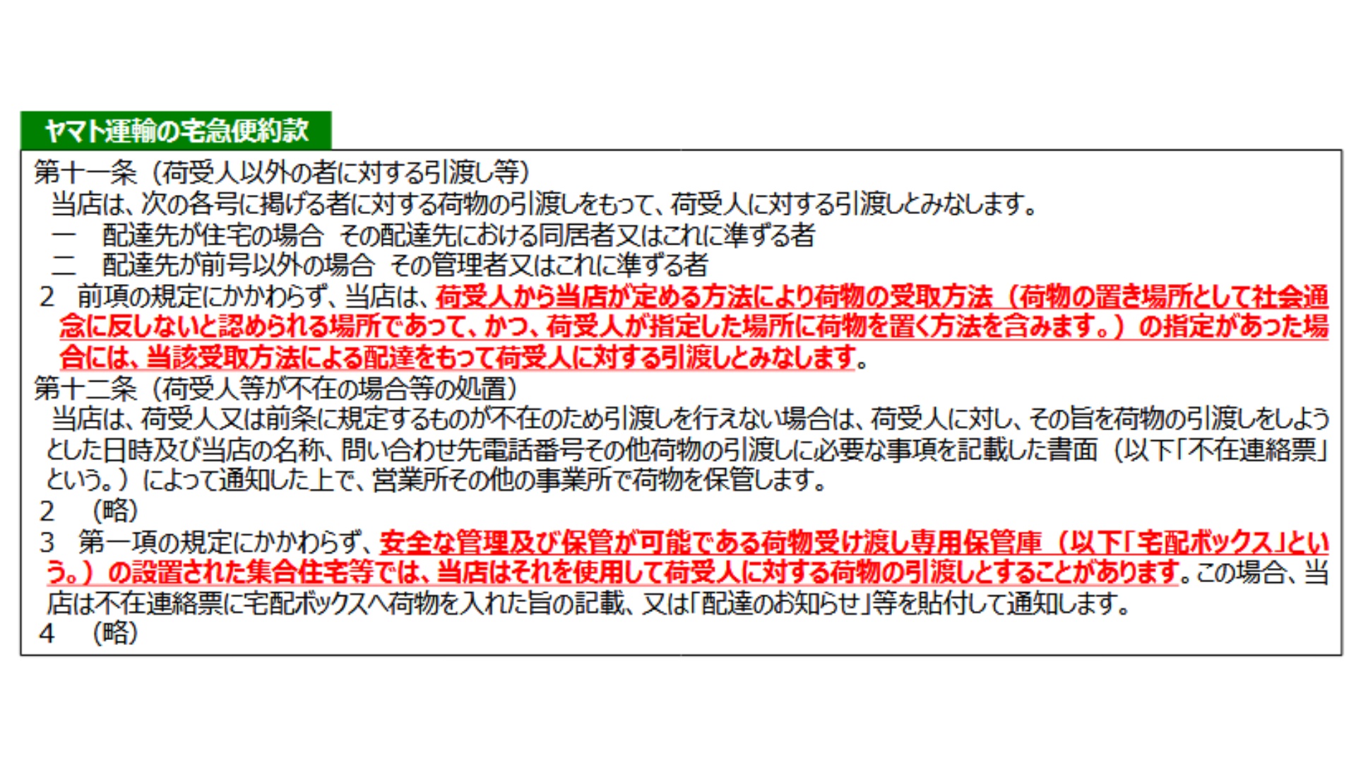 ヤマト運輸の「宅配便運送約款」では置き配や宅配ボックスについて記載(出典:国土交通省)