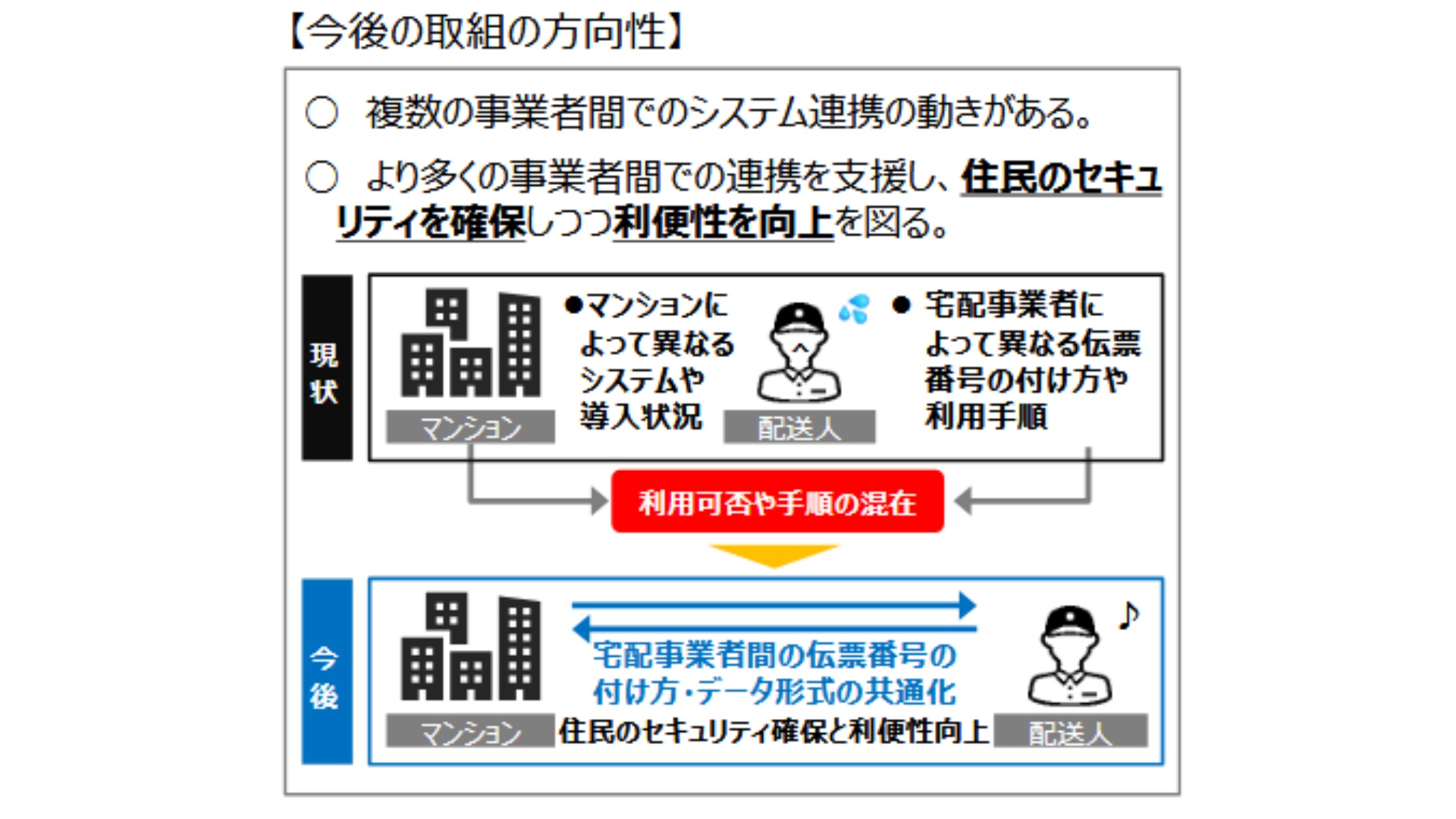 マンションオーナーや管理組合の同意形成が前提だが、基本的に現状では事業者ごとに異なるシステムが導入されているため、住民はエントランス解錠による「置き配」を選択しにくい。ただ最近では複数事業者間でシステム連携の動きが進んでいることもあり、伝票番号など配送データ形式の共通化を事業者間で進めるための開発費用補助支援策について検討を行う。国土交通省は早ければ26年度に共通システムの導入を予定している。