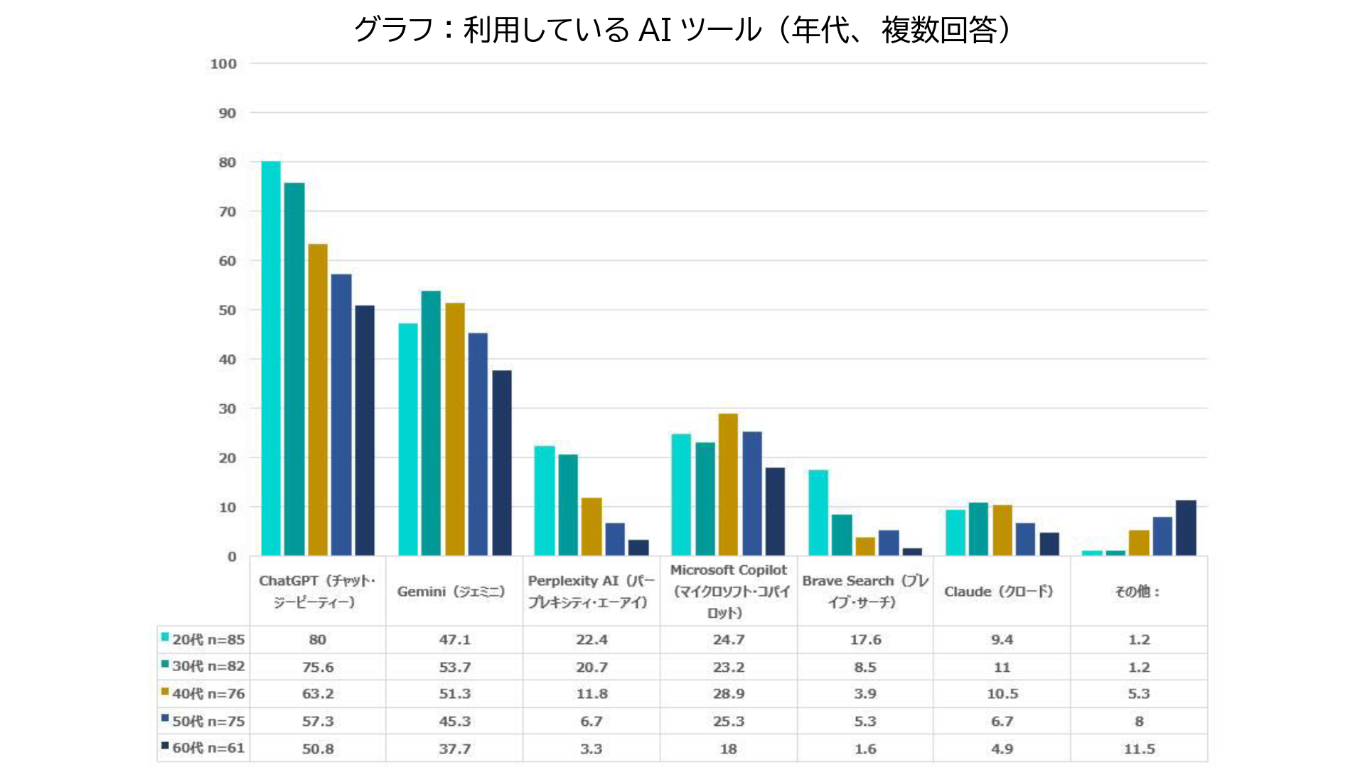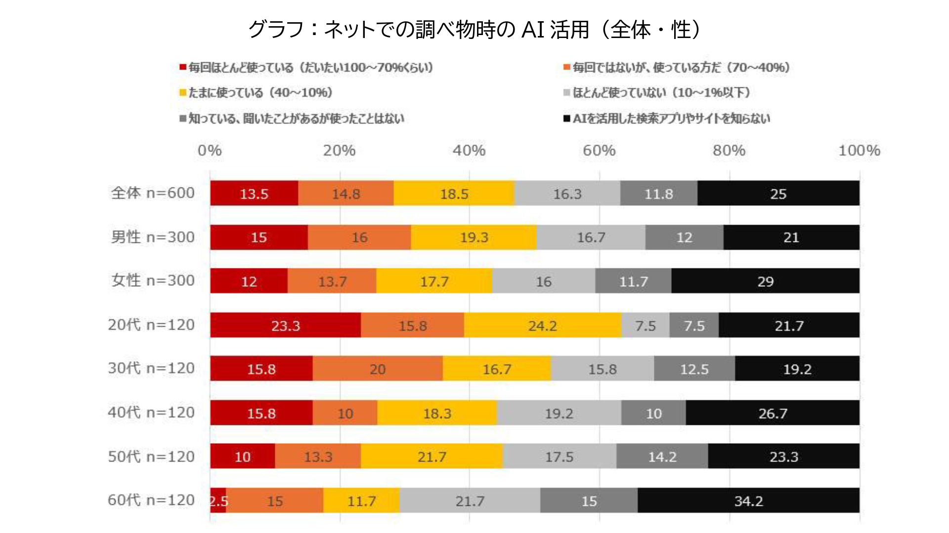 まず驚くのが、調べ物にAIを使った経験がある人は若い世代だけではないという点です。