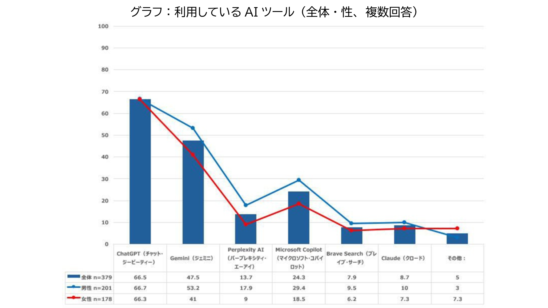 使われているAIツールとしては、チャット・ジーピーティー(66.5ポイント)で、男女別での差は認められませんでした。一方2、3番手のツールでは性差が見られ、本設問が複数回答であることから、男性の方がジェミニやマイクロソフト・コパイロットといった複数のAIツールを使っていることが明らかです。