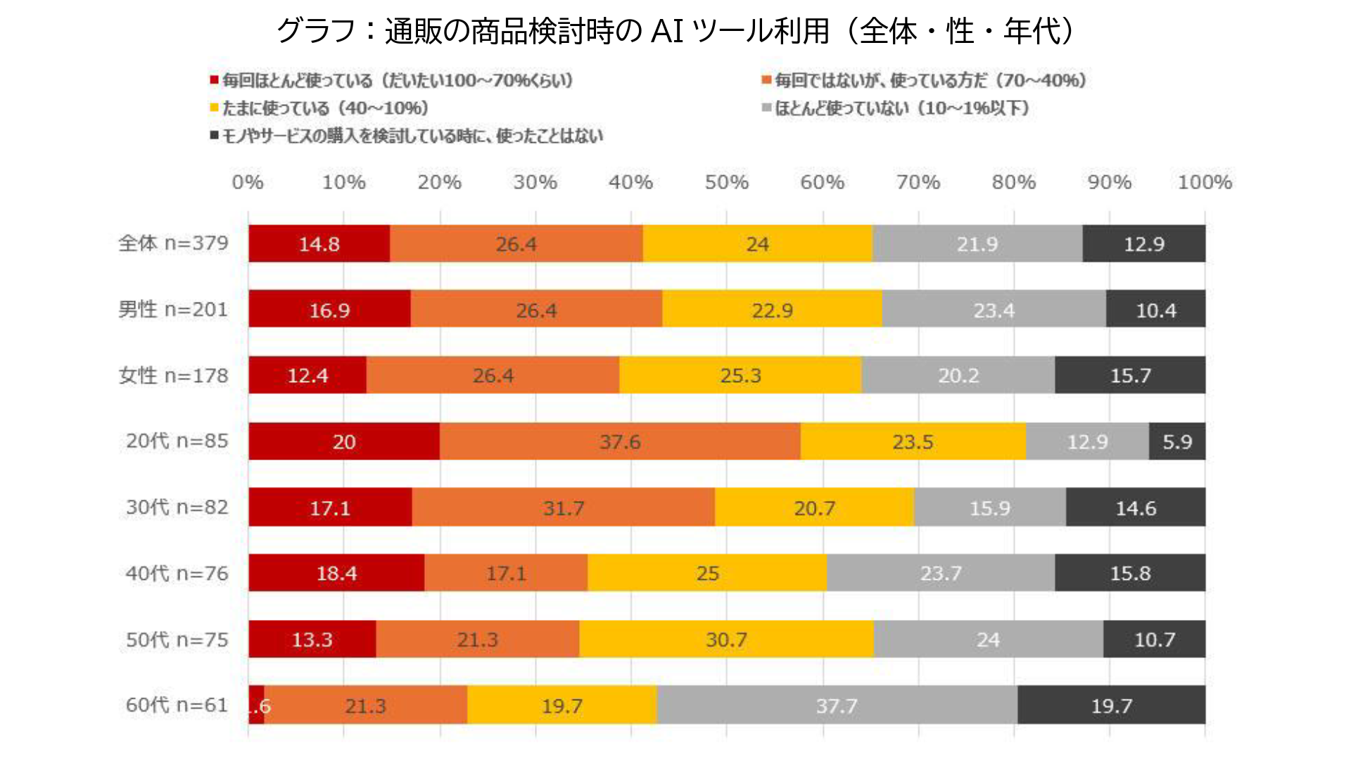 調べ物にAIツールを使っている層のみに、通販で商品を買うときにAIを使うかどうかを尋ねた結果を見ると、若い層では確実に利用が増えていて、「AIで情報を整理してから買う」スタイルが広がっていることがうかがえます。
