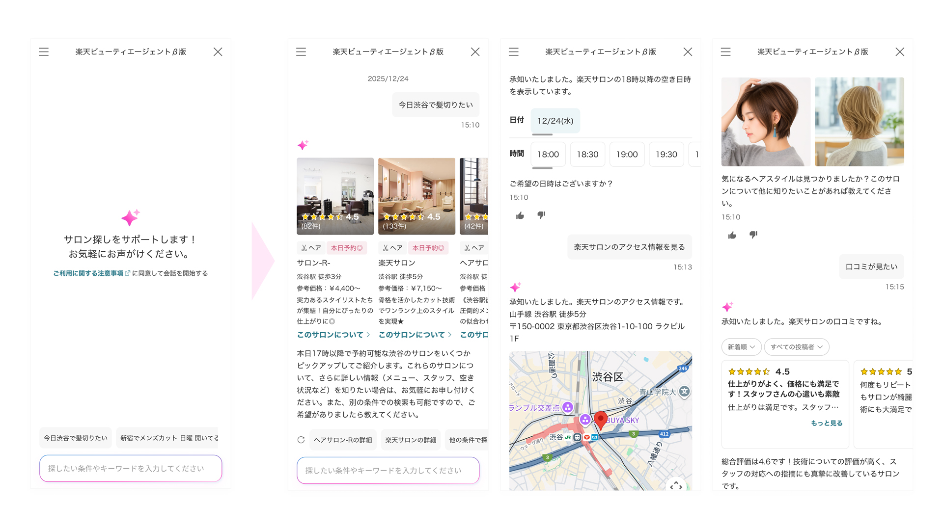 「楽天ビューティエージェントβ版」は、「楽天ビューティ」に掲載されているサロンの基本情報、メニュー、スタッフ情報、クチコミなどのデータを基に、ユーザーのニーズに合わせてサロン選びをサポートする。